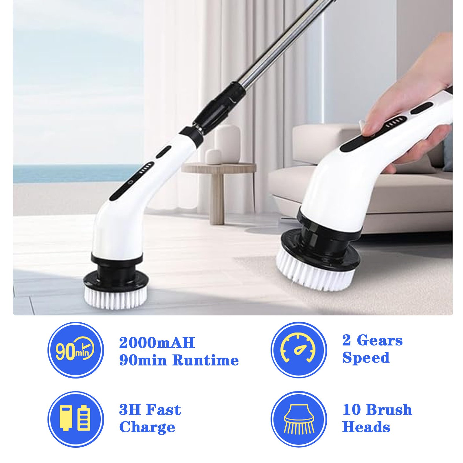 [10 in 1 Reusable Brush Heads]Our cordless cleaning brush offers 10 versatile replaceable brush heads, suitable for different scenarios. For example, cleaning concave areas like bathtubs and sinks, cleaning narrow and hard-to-reach areas like corners and gaps as well as cleaning grounds, glass, tile wall, car surface, wheel hub, car seat, furniture and stove.