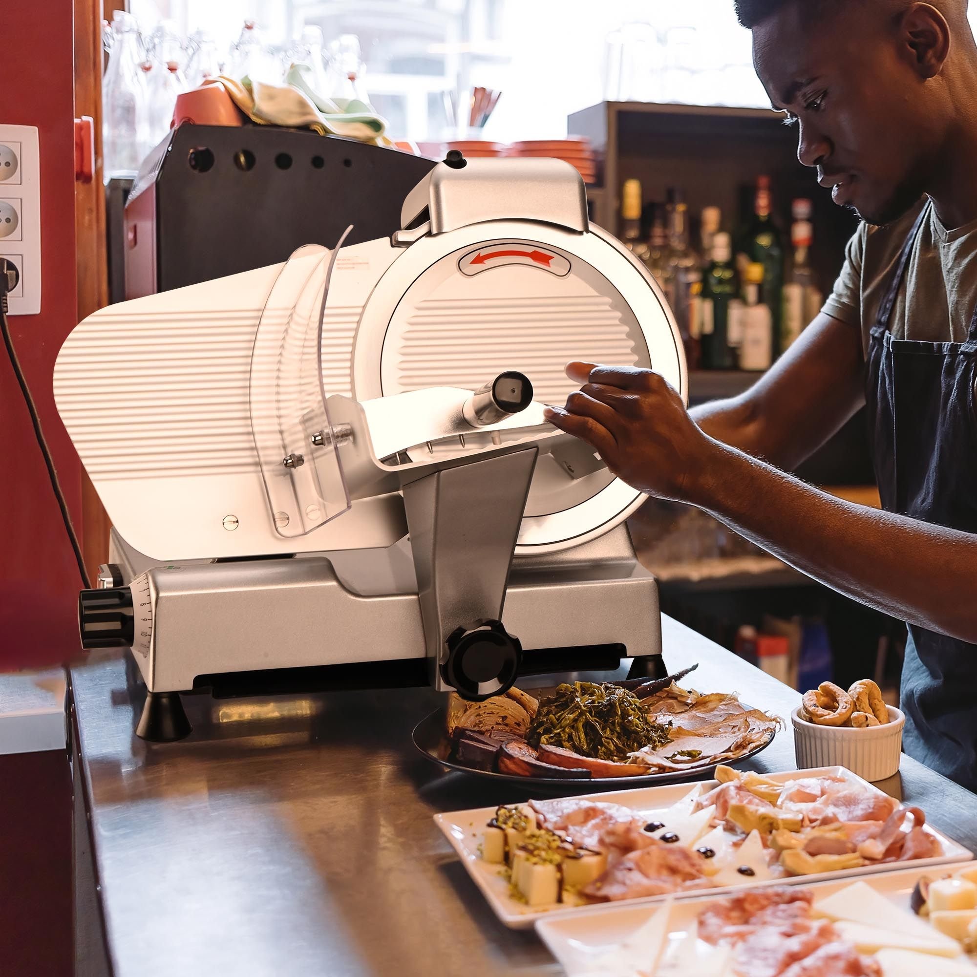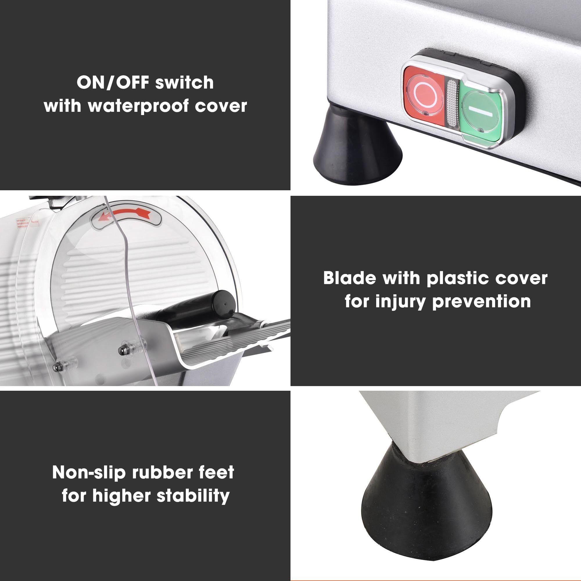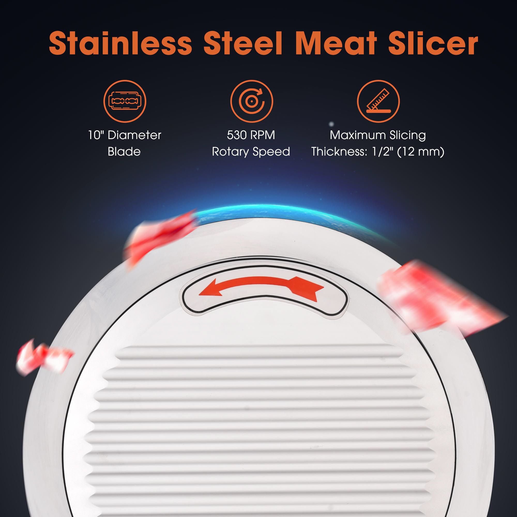 - 240W Powerful Meat Slicer - 110V 240W Commercial Meat Slicer with 10" blade features 530 RPM high torque motor for fast slicing food in seconds, perfect to process raw meat, bread, vegetables for lunch or party, also meet the demands of commercial use like restaurants, hotels, coffee shops, etc.