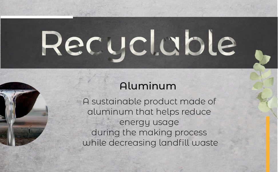 ECO-FRIENDLY. A sustainable product made of recycled aluminum that helps reduce energy usage during the making process while decreasing landfill waste.