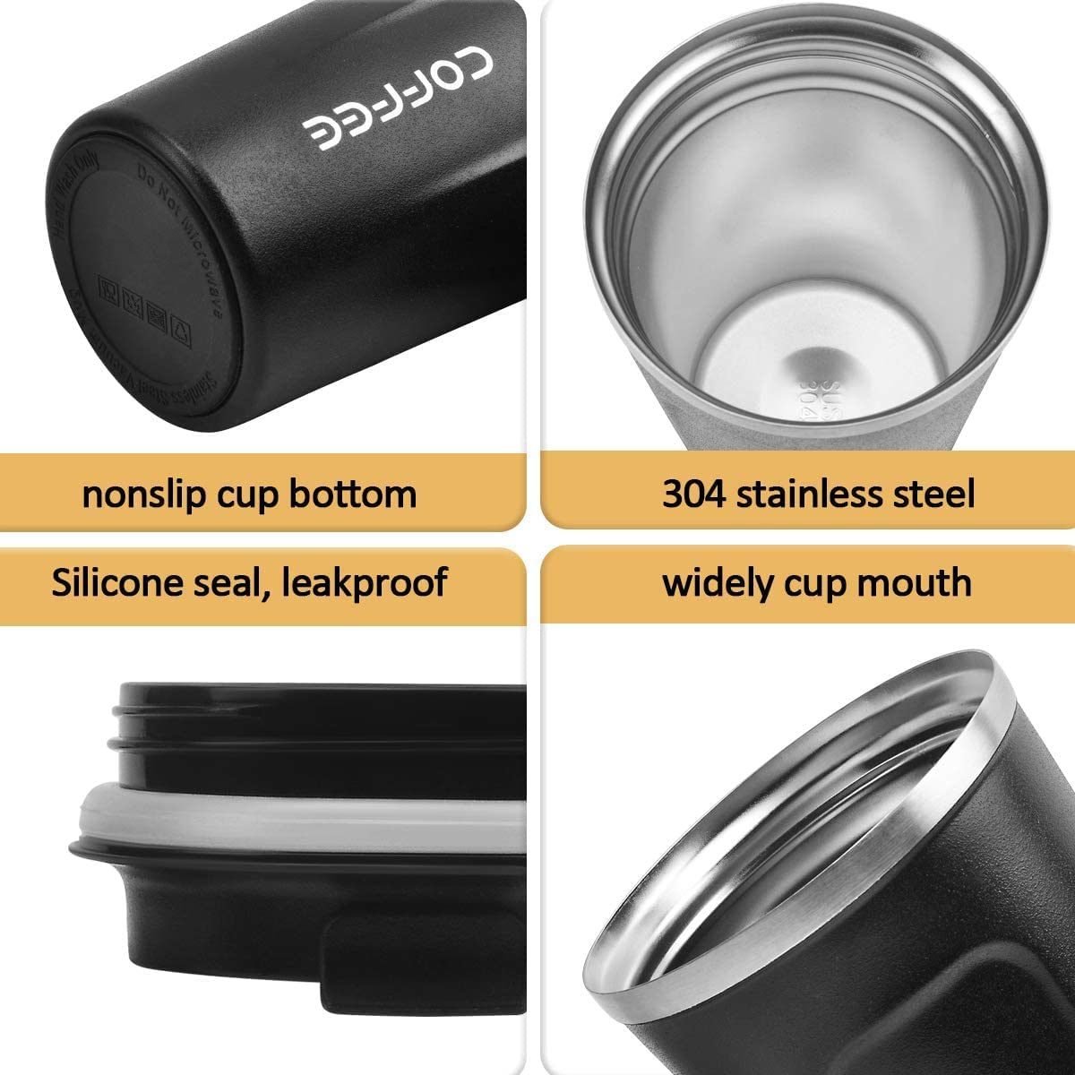 Leakproof Design - The coffee mug lid comes with an airtight silicone seal that prevents the drinks from spilling. Air Vent on the lid allows beverages to flow out smoothly; without gushing or overflowing.The rubber design at the bottom prevents the cup from slipping or tipping.