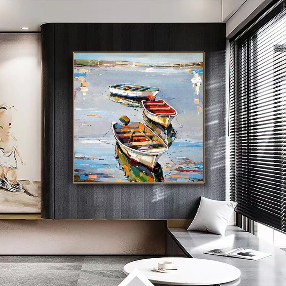 Hand Painted Oil Painting Canoe oil Paintings Nordic Seascape-Hand-Painted- Colorful Boats Oil Painting-Wall Art Handmade- For Home Decoration