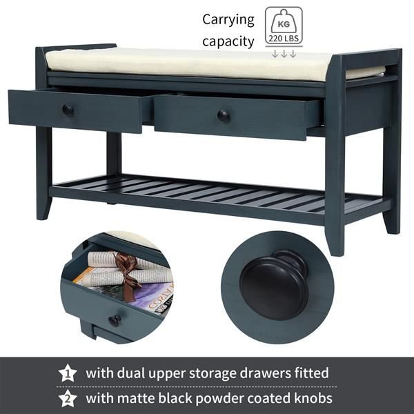 Twin Over Twin Bunk Beds with Trundle, WhiteThis bunk bed with trundle comes in a rustic style appearance and consists multifunctional features. The whimsical 2 beds plus 1 trundle in 1 design makes this bunk bed the ideal centrepiece that completes the look of any bedroom.Whether you are seeking for a sweet and cuddling beds or independent beds for your children when they grow up, this is the bunk bed that surely determines your needs and brings out the maximum childhood experience.DescriptionProduct TypeBunk BedSizeTwin over TwinColorWhiteMaterial (main)Pine + Plywood + PBNumber of SlatsUpper:14pcs / Lower:14pcs / Trundle:7pcsSpring BoxNo needAssembly RequiredYesManual and HardwareYesCountry of OriginVietnamTechnical DetailsOverall Product Dimension79.53"L x 44.26"W x 59.85"HOverall Product Weight134.49 lbsPackage DetailsPlease refer to the SpecificationBed Weight CapacityUpper: 200 lbs / Lower: 200 lbs / Trundle: 200 lbsSuggested Mattress Thickness6 inches or lessAdd a touch of organic essence to your abode with this wooden storage bench. The taupe slightly weathered natural wooden finish adds the perfect understated accent to any home, blending in seamlessly with any surrounding décor with 5 shades to choose from. The carefully crafted silhouette emphasizes classic details, including tapered legs and a gridded base shoe rack with dual upper storage drawers fitted with matte black powder coated knobs.Ideal for family use,this classic bench functions as the perfect inconspicuous storage option to tastefully store your personal belongings rather than leaving them out in the open and accumulating clutter. Two spacious sliding drawers sit directly underneath the upper bench seating area giving you easy access to sandals, kids'shoes and more while the underside gridded rack can hold additional shoes or storage baskets to add your own personal touch.This bench proves to be more than an eye-catching accent piece and is manufactured to pull its weight with its heightened functionality. With a spacious upper seating deck, it is fitted perfectly with a soft beige cushion that can be further customized with decorative throw pillows. Comfortable sit down and take your time while you put on you or your child's shoes instead of uncomfortably crouching at the front door. Compact in design this piece also makes a big impact with a small foot print.This bench is manufactured with a premium build compared to competitors. Constructed with thick slabs of pine wood, it has the durability to effortlessly withstand daily use from you and your family and become a household stable. Smoothed and polished to perfection, the wood build is sealed with a protective wood coating this bench is designed to resist humidity while also making it easy to spot clean for dust. Built in handles make it easy to transfer from one place to another.Light assembly required so your bench is ready to go soon after it arrives. If you have any questions or concerns, please feel free to contact us.