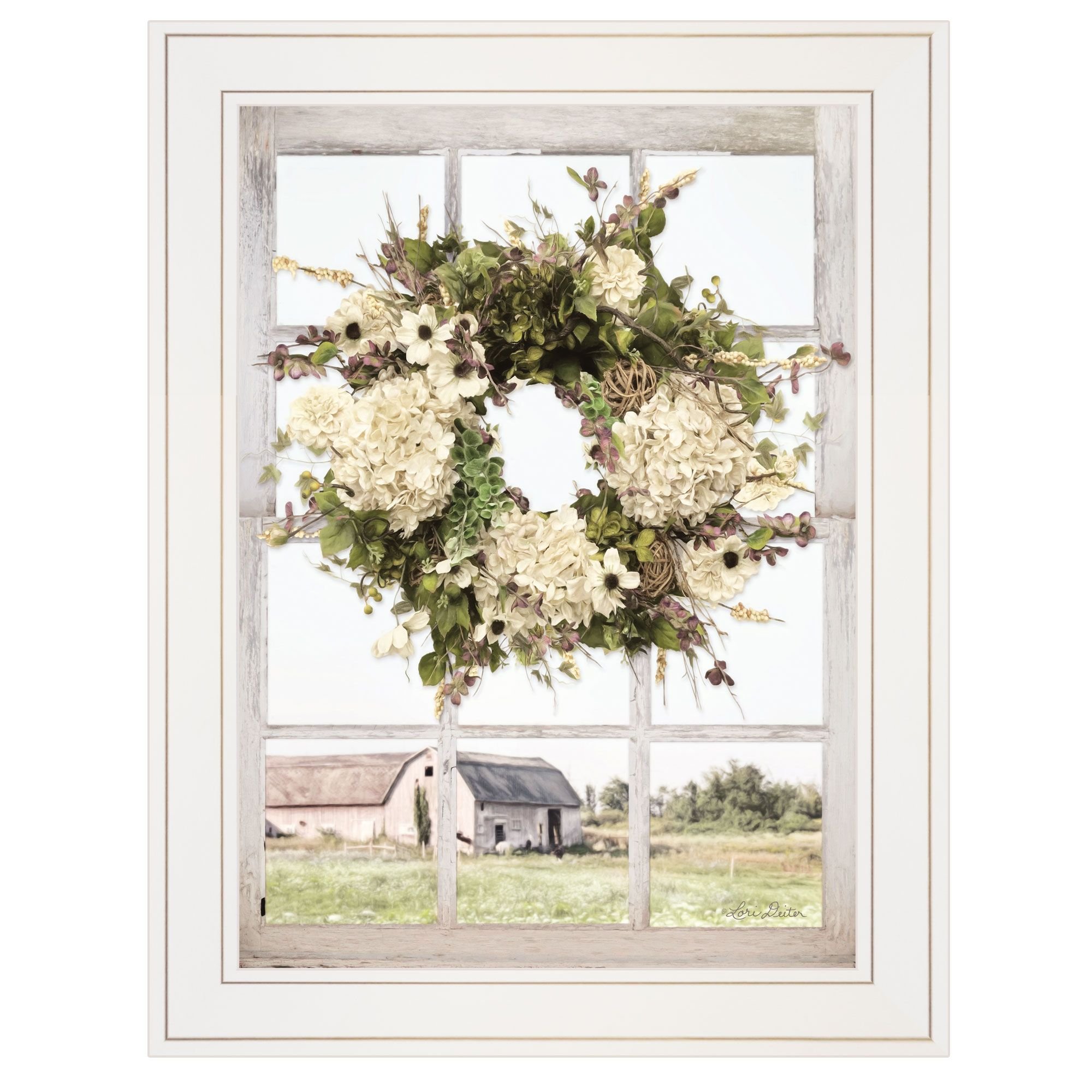 "Pleasant View" window frame print by Lori Deiter. White framed size is 15x19. A window view of a farm, along with a wreath hanging on the window frame. The surface of the print is textured with a fade resistant coating so no glass is necessary. Arrives ready to hang. Made in the USA by skilled American workers. Crafted By Skilled American Crafters And Coated With A Fade-resistant Texture, This Piece Has A Canvas-like Appearance That Will Last For Years To Come. Invest In A Piece That Is Truly One-of-a-kind.•Transform your walls with this stunning piece of art and bring a touch of modern elegance to your room. This stunning piece will not only add visual interest to any room but it's minimalist design will bring a sense of serenity to your space.•Tired of dull, empty walls in your home? We believe that walls should inspire, not bore. That's why we offer a wide range of wall art to suit any space from bedroom and kitchens to office and beyond. Give your walls a facelift with our printed arts and transform your space into a stylish and inviting home.•This framed wall art is hand-crafted in the USA of high-quality wood with the surface of the art coated with a fade-resistant texture which gives it a canvas-like appearance for many years of enjoyment in your home.•Bring a pop of colour and style to any room with our fully assembled and ready-to-hang wall art. With a wide selection of decorative pieces to choose from, you'll easily find the perfect match for your personal taste or to give as a thoughtful gift. Don't miss out on the opportunity to add some unique charm to your space.•Experience the unmatched quality and durability of American-made craftsmanship with this individually hand-crafted wall decoration art. Skilled crafters put their expertise into every piece to ensure it will stand test of time and bless your eyes for years to come.