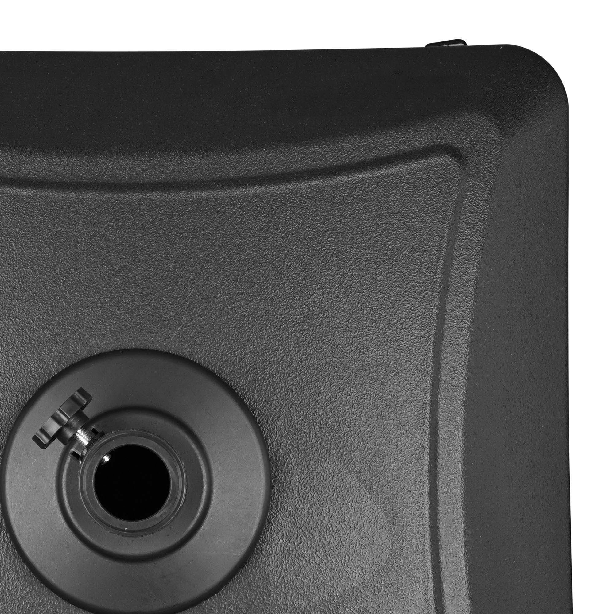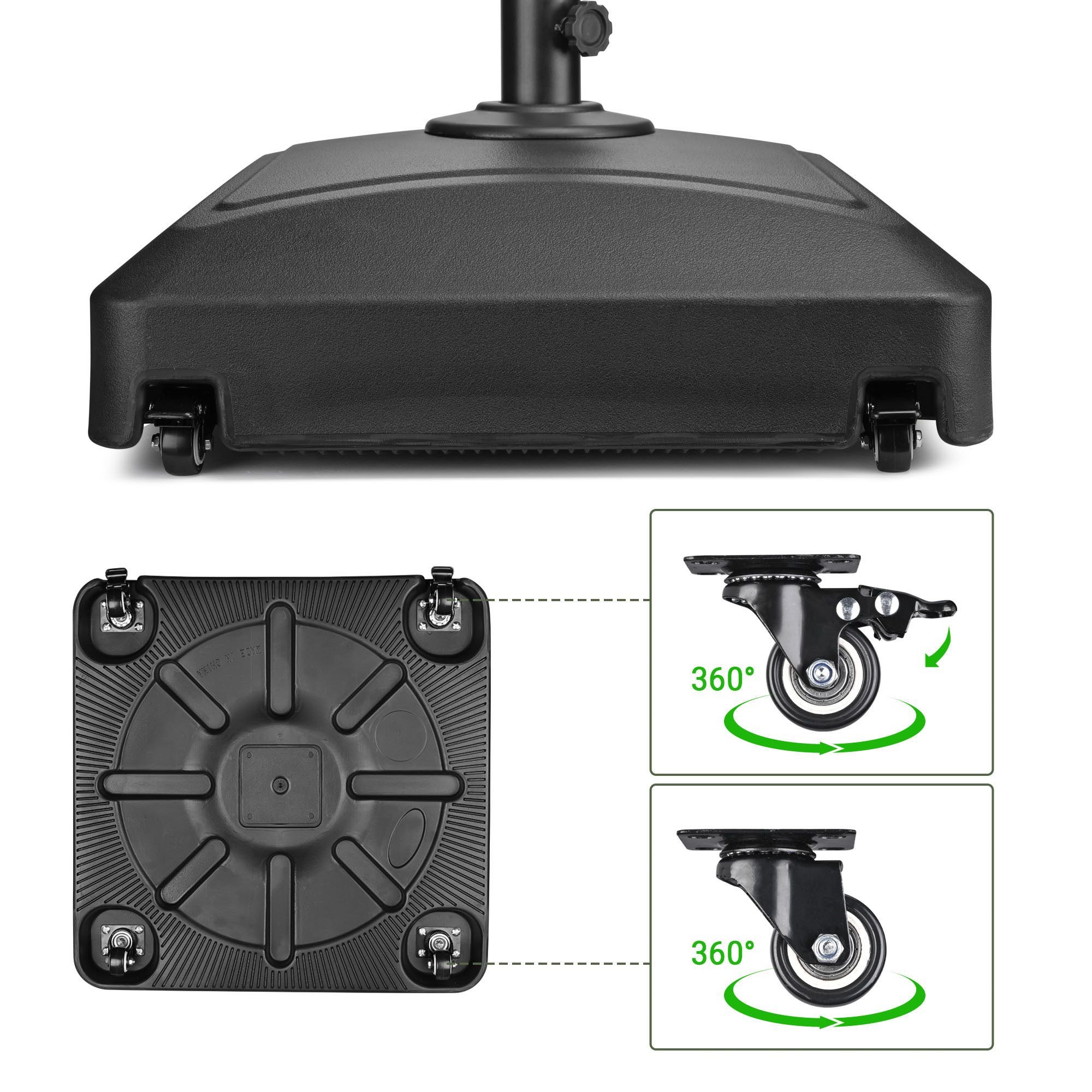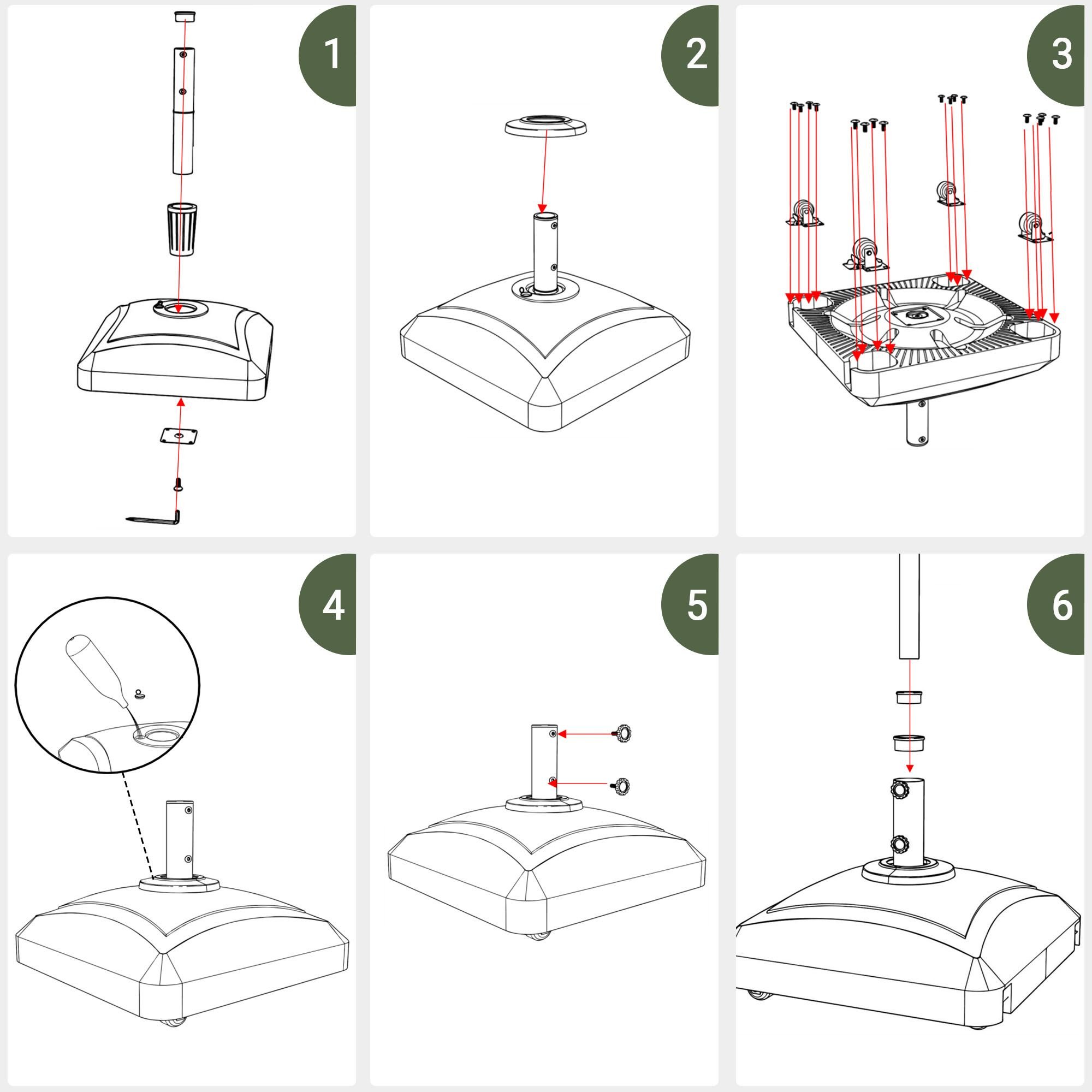 - Easy DIY Installation - Quick and simple assembly by securing the umbrella holder onto the base; installing 4 wheels; filling the base with water or sand; and finally inserting the umbrella and fastening the knobs