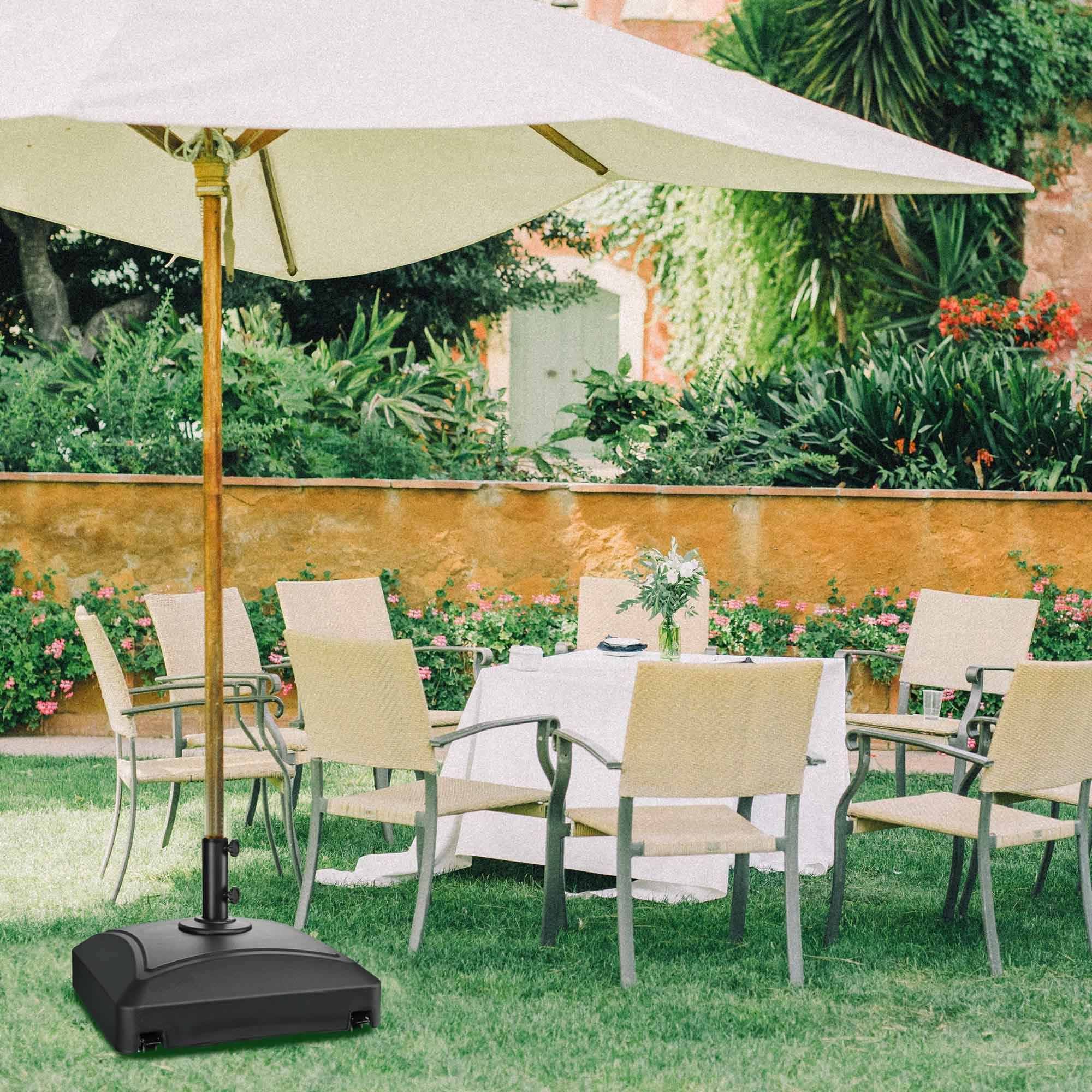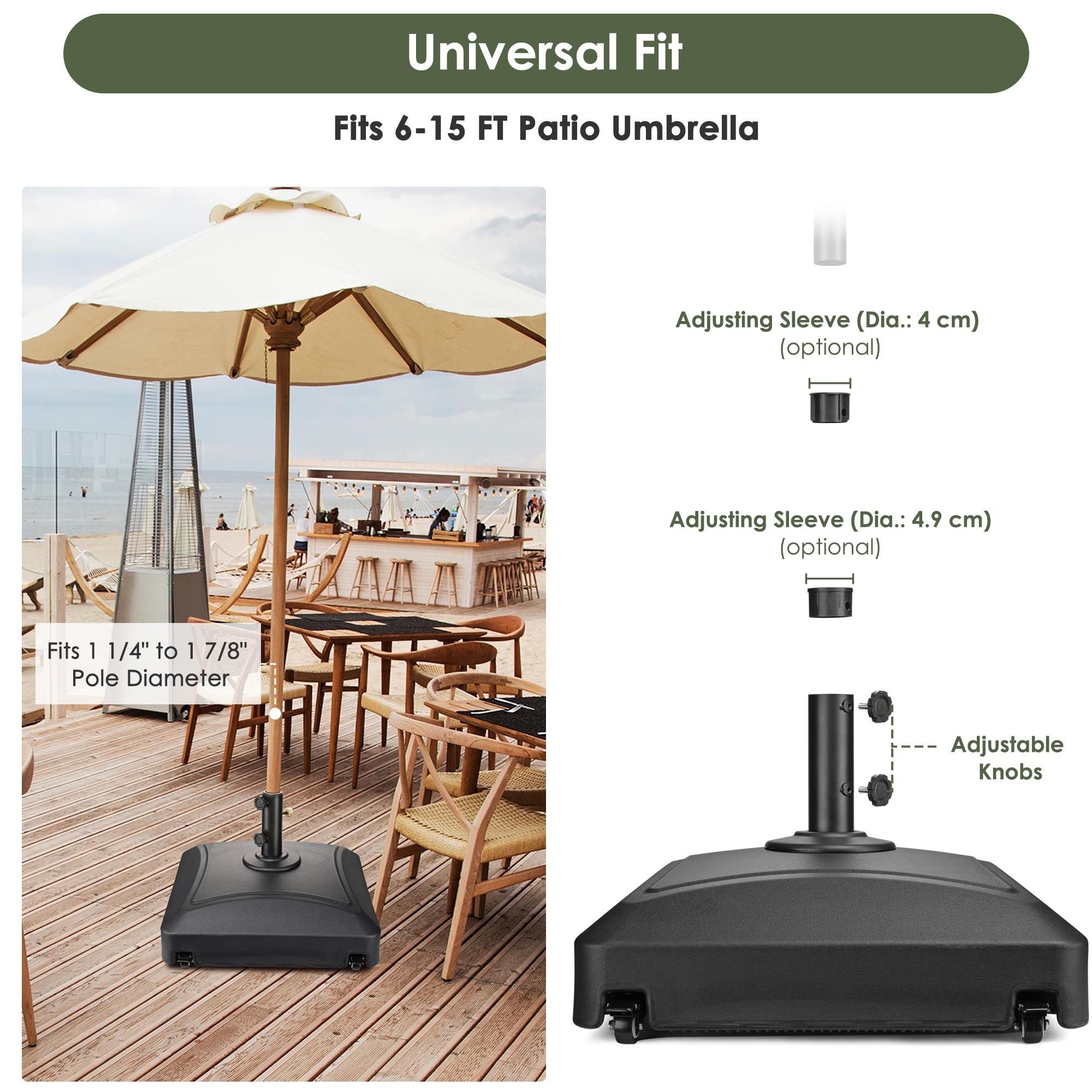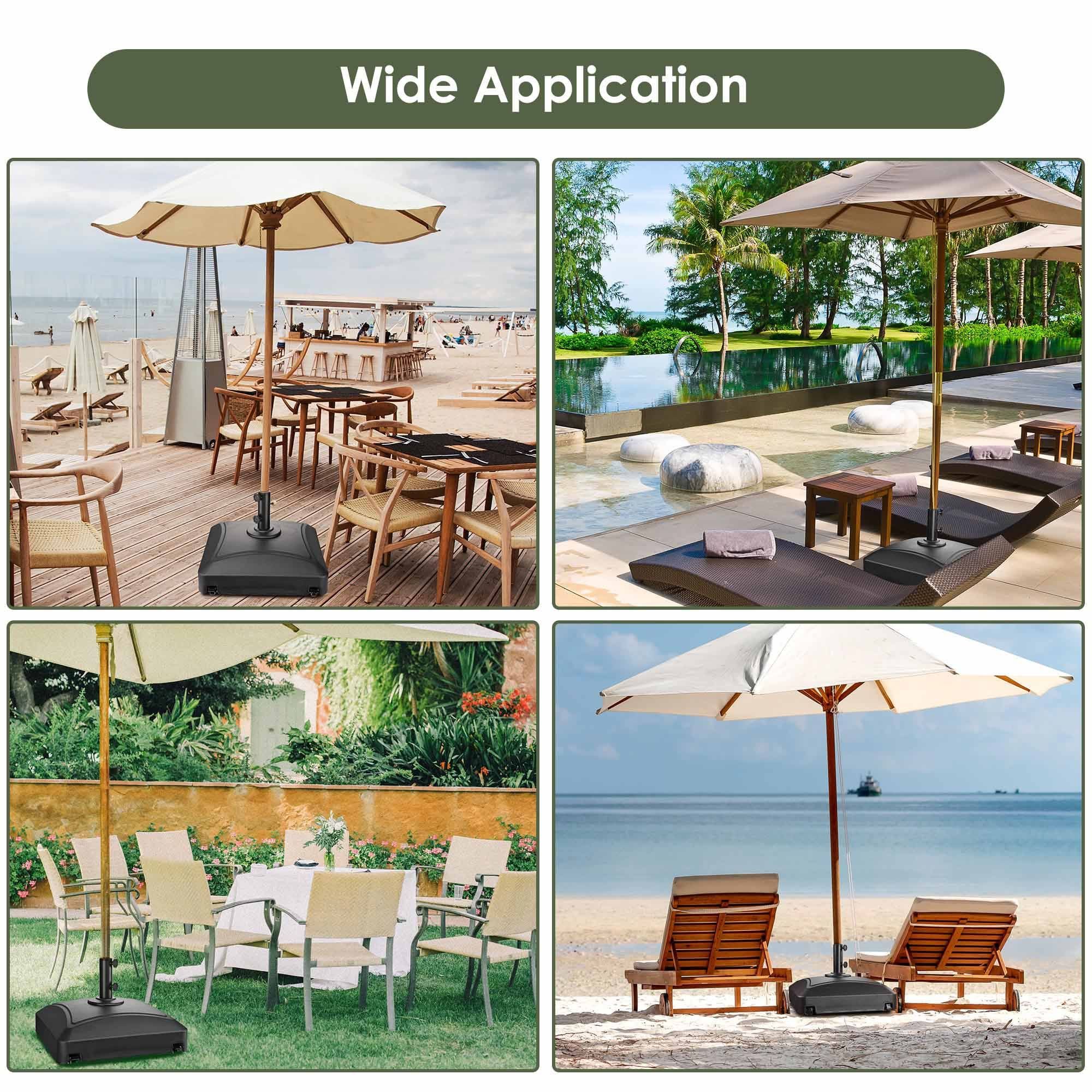 - Easy Mobility - This 22"x22"x15" Patio Umbrella Base with 4 universal wheels can be moved easily to any place you like; while 2 wheels are lockable to keep your umbrella stand still for added stability in the outdoor areas; Weighs only 11 Lbs when empty; easy to carry to different venues for use such as picnics; camping; flea markets; sports events; outdoor gatherings; or pool parties