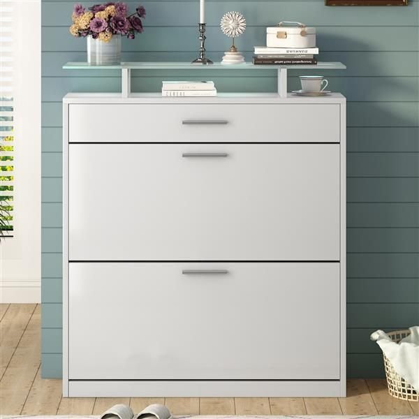 Adjustable Shoe RackThe panel in each compartment can be adjusted or removed to hold different sizes of shoes, which makes this shoe cabinet accommodates every kinds of shoes from slippers to boots.Stylish DesignWith simple yet elegant color, silver handles and LED light clamps, this shoe cabinet features a sleek modern design that perfectly complements any contemporary home aesthetic.Great Storage CapacityThe two flip drawers are practical for up to 16 pairs of shoes. It also includes a handy drawer with extra space for accessories like shoe polish or extra laces. The glass top is also a great place to display decorations.Stable & DurableIt is built with high-quality materials such as particle board, 5mm tempered glass, and top-quality hardware fittings. Its sturdy construction ensures it can withstand the rigors of daily use.Product detailsProduct TypeShoe CabinetTop ColorWhiteTop MaterialParticle BoardTop Finish ApplicationVeneerBase ColorWhiteBase MaterialParticle BoardBase Finish ApplicationVeneerWeight CapacityGlass Top: 22LBS / Flip Drawer: 33LBS / Top Drawer: 11LBSDetailed MeasurementOverall: 35''W x 9.4''D x 40.9''H / Drawer: 31.5''W x 7''D x 3.5''HCountry of OriginChinaDrawers IncludedYesNumber of Drawers3Drawer Slide MechanismBall Bearing SlidesDrawer Slide MaterialMetalTable Top Thickness5mmLevel of AssemblyFull Assembly NeededSuggested Number of People for Assembly/Install2Estimated Time to Set Up1 hAdult Assembly RequiredYesWith simple yet elegant color, silver handles and LED light clamps, this shoe cabinet features a sleek modern design that perfectly complements any contemporary home aesthetic.The panel in each compartment can be adjusted or removed to hold different sizes of shoes, which makes this shoe cabinet accommodates every kinds of shoes from slippers to boots.The two flip drawers are practical for up to 16 pairs of shoes. It also includes a handy drawer with extra space for accessories like shoe polish or extra laces. The glass top is also a great place to display decorations.It is built with high-quality materials such as particle board, 5mm tempered glass, and top-quality hardware fittings. Its sturdy construction ensures it can withstand the rigors of daily use.
